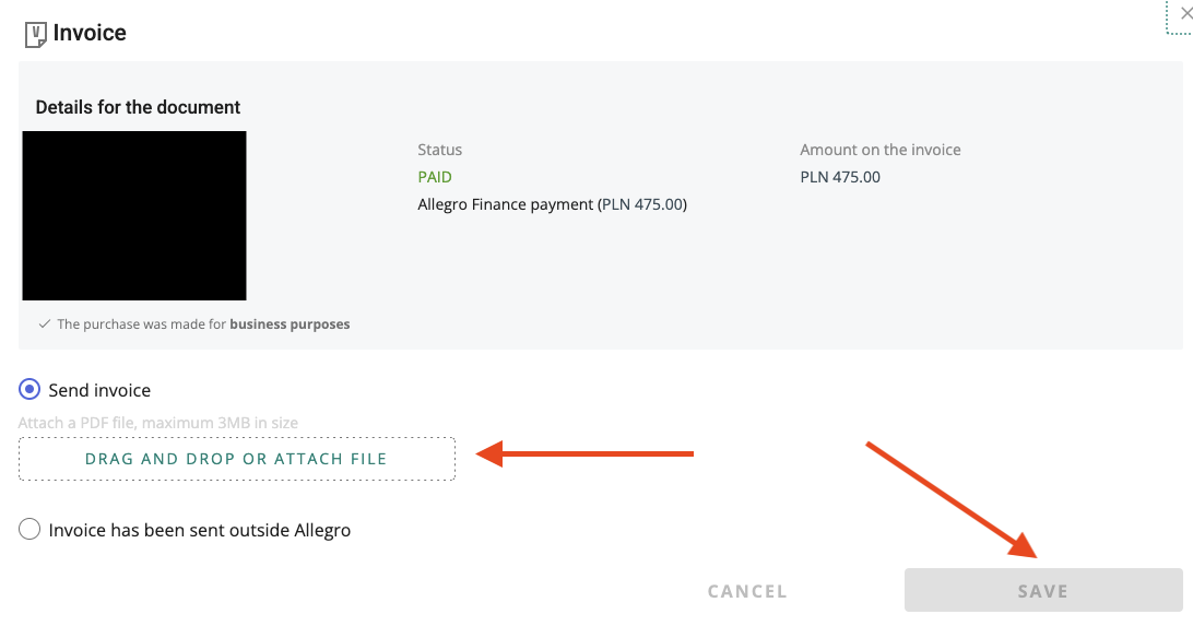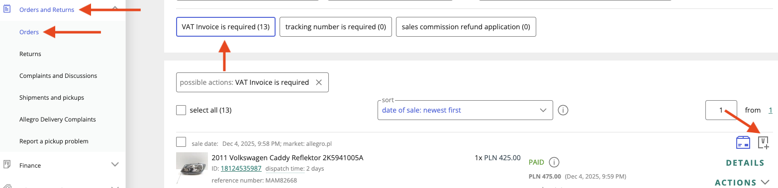 ⏺ SF automatiškai klientui nesisiunčia, ją reikia įkelti Allegro, bet tik tiems klientams, kurie jos prašo. Einame į Sales Center, Orders and Returns, Orders, spaudžiame VAT invoice is required, spaudžiame SF ikonėlę.