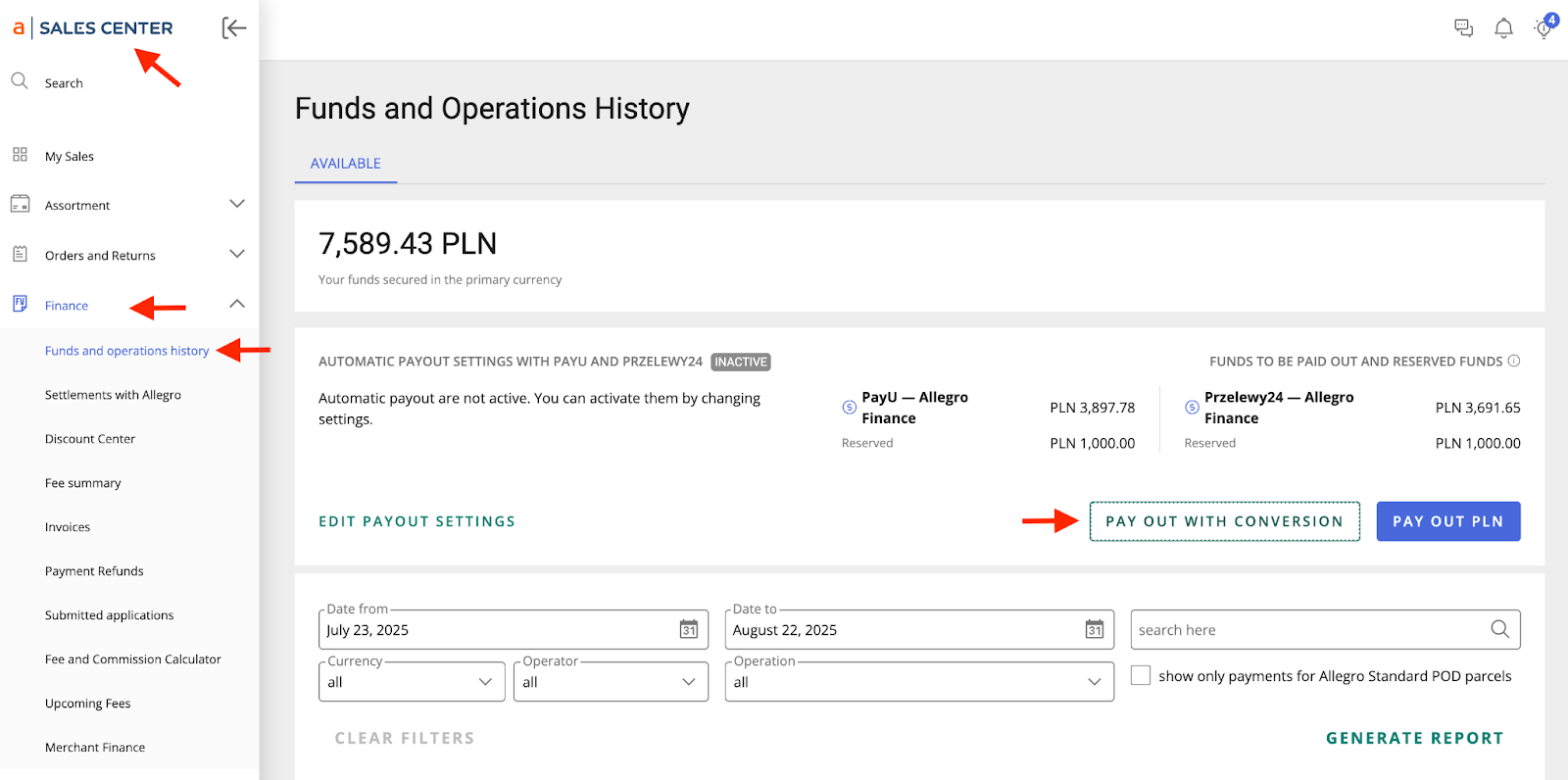 ⏺ Išsimokėti pinigus galite kada norite ir kiek norite rankiniu būdu. Kad išsimokėti pinigus, einame į Sales Center / Finance / Funds and operations history, spaudžiame Pay out with conversation.