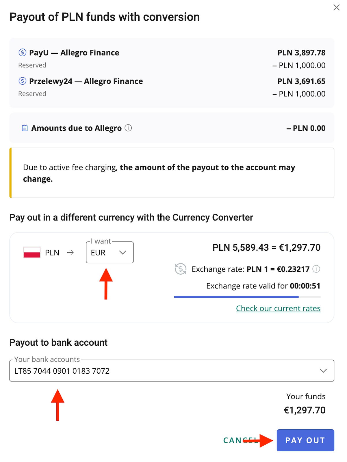 ⏺ Pasirenkame EUR, pasirenkame savo banko sąskaitą ir spaudžiame Pay Out.